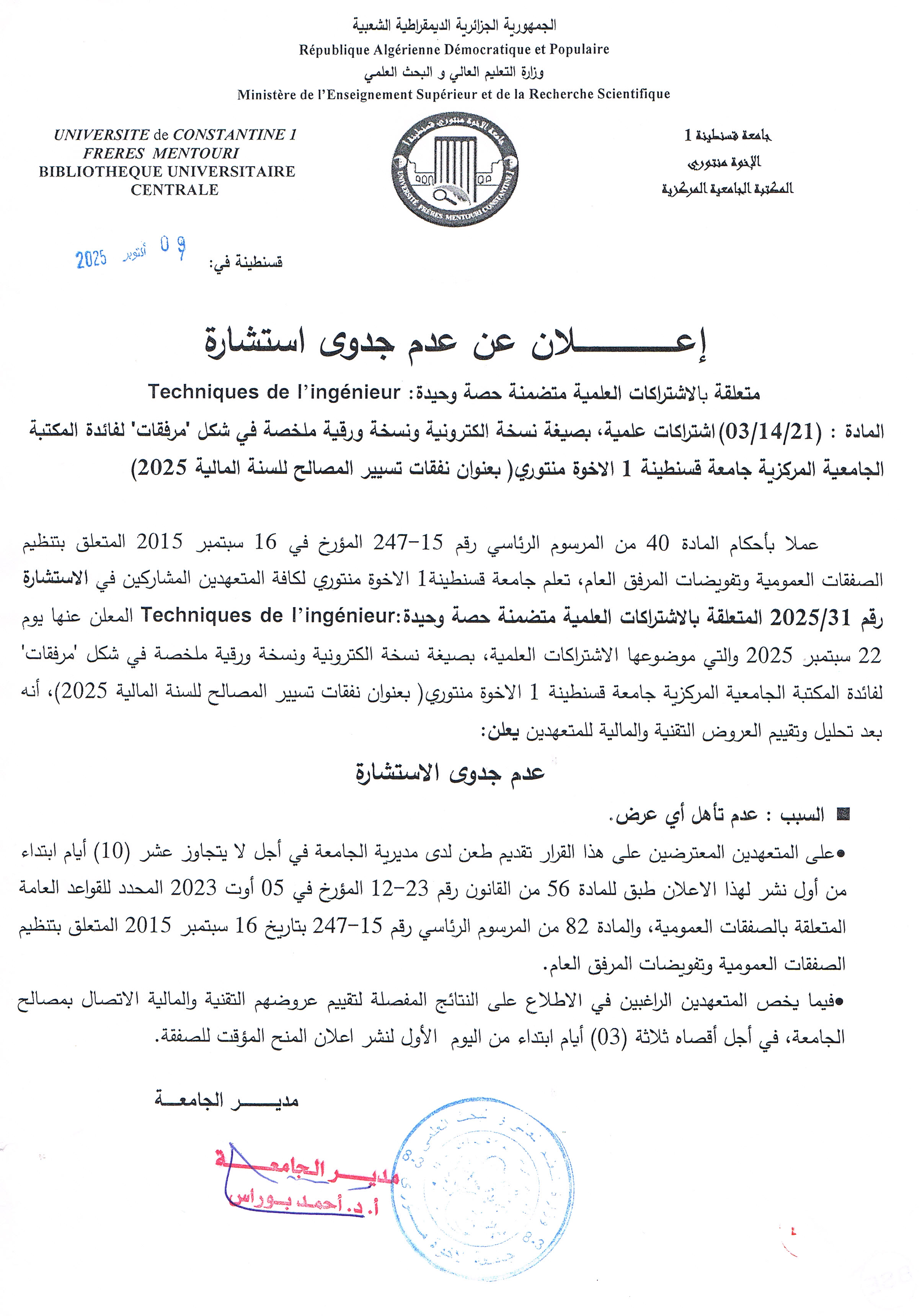 إعـــــــــــــــــــــلان عن عدم جدى استشارة متعلقة بالاشتراكات العلمية متضمنة حصة وحيدة: Techniques de l’ingénieur