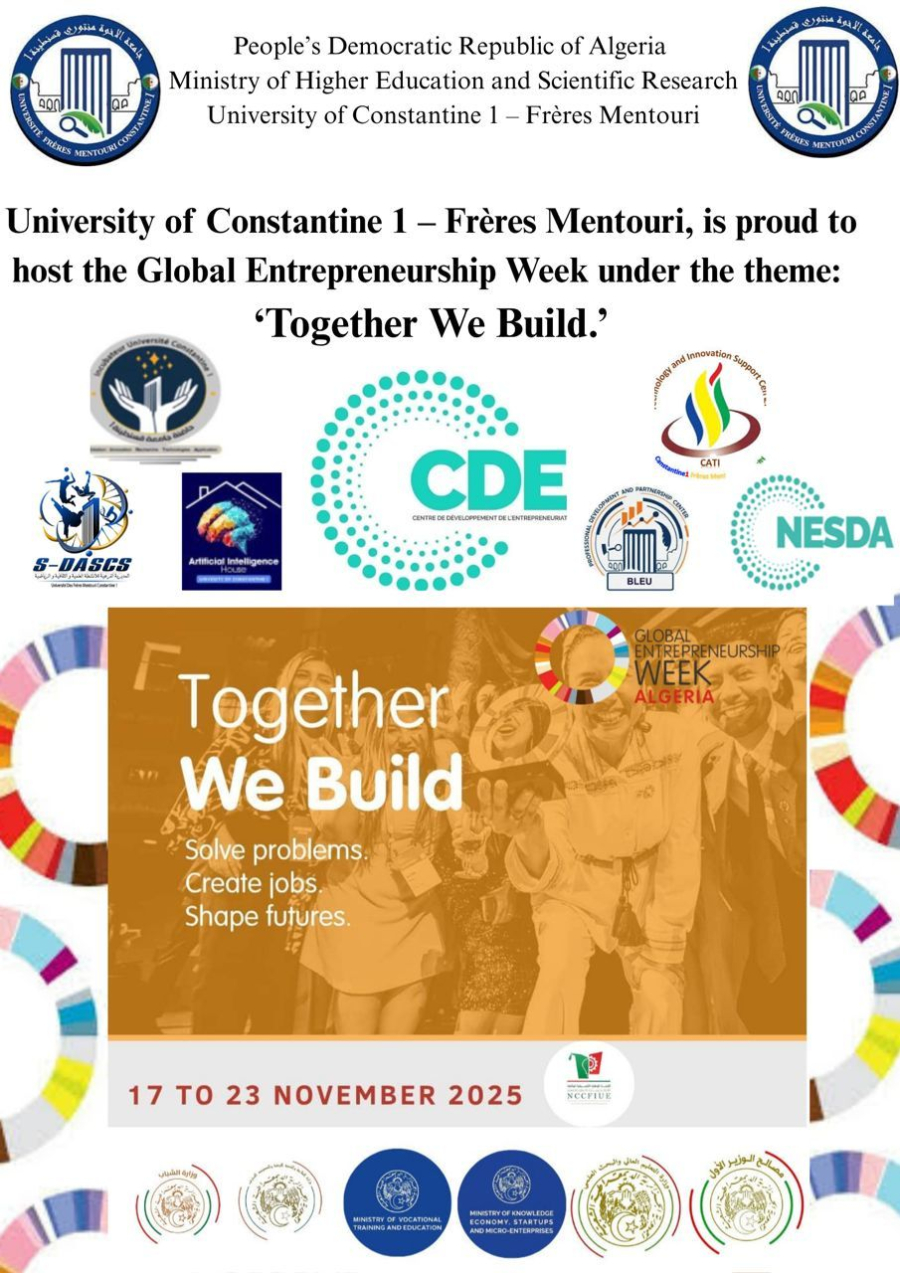 يتشرّف مدير جامعة قسنطينة 1 – الإخوة منتوري،بدعوة كل الأساتذة و الطلبة وكافة الشركاء الاقتصادين و شركاء الجامعة لحضور فعاليات حفل افتتاح الأسبوع العالمي للمقاولتية، الممتد من 17 إلى 23 نوفمبر 2025، وذلك يوم 17 نوفمبر 2025 بالمركز البحثي CHEMS ابتداءً من الساعة 13:30
