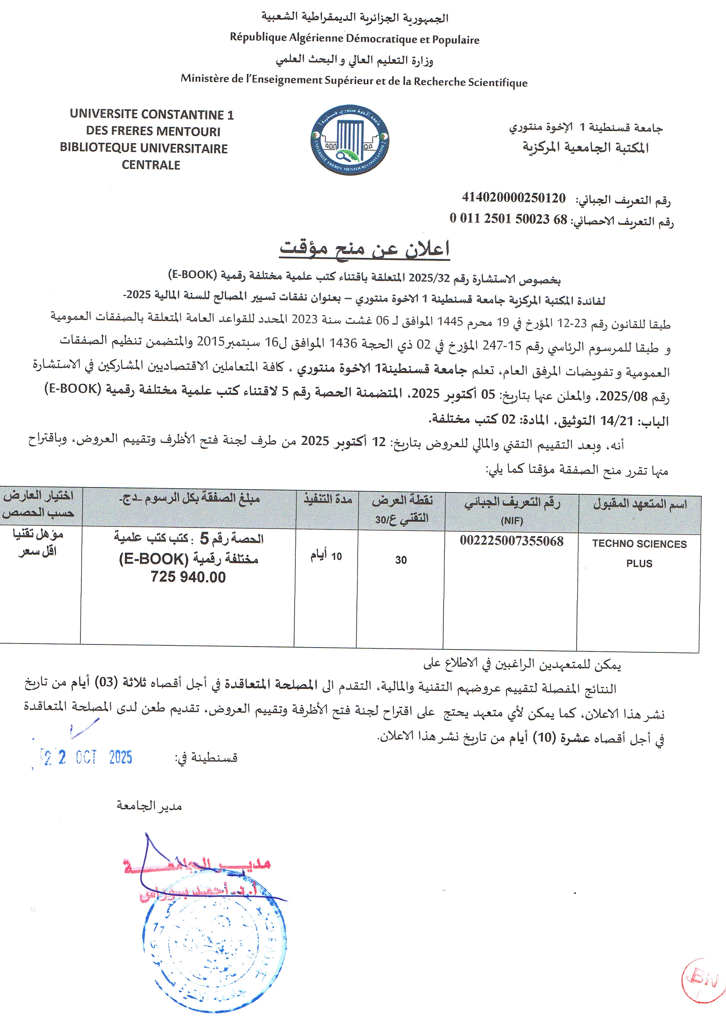 الاعلان عن المنح المؤقت متعلقة باقتناء كتب مختلفة، حصة رقم5 كتب علمية مختلفة رقمية (E-BOOK) لفائدة المكتبة الجامعية المركزية جامعة قسنطينة 1 الاخوة منتوري، بعنوان نفقات تسيير المصالح للسنة المالية 2025