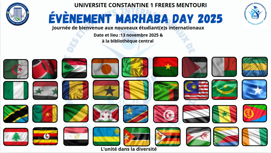 L’Université de Constantine 1 – Frères Mentouri organise, le jeudi 13 novembre 2025 à 11h00 à la Bibliothèque Centrale, la journée “Student Marhaba Day”, dédiée à l’accueil et à la mise à l’honneur des étudiants internationaux inscrits au sein de l’université.