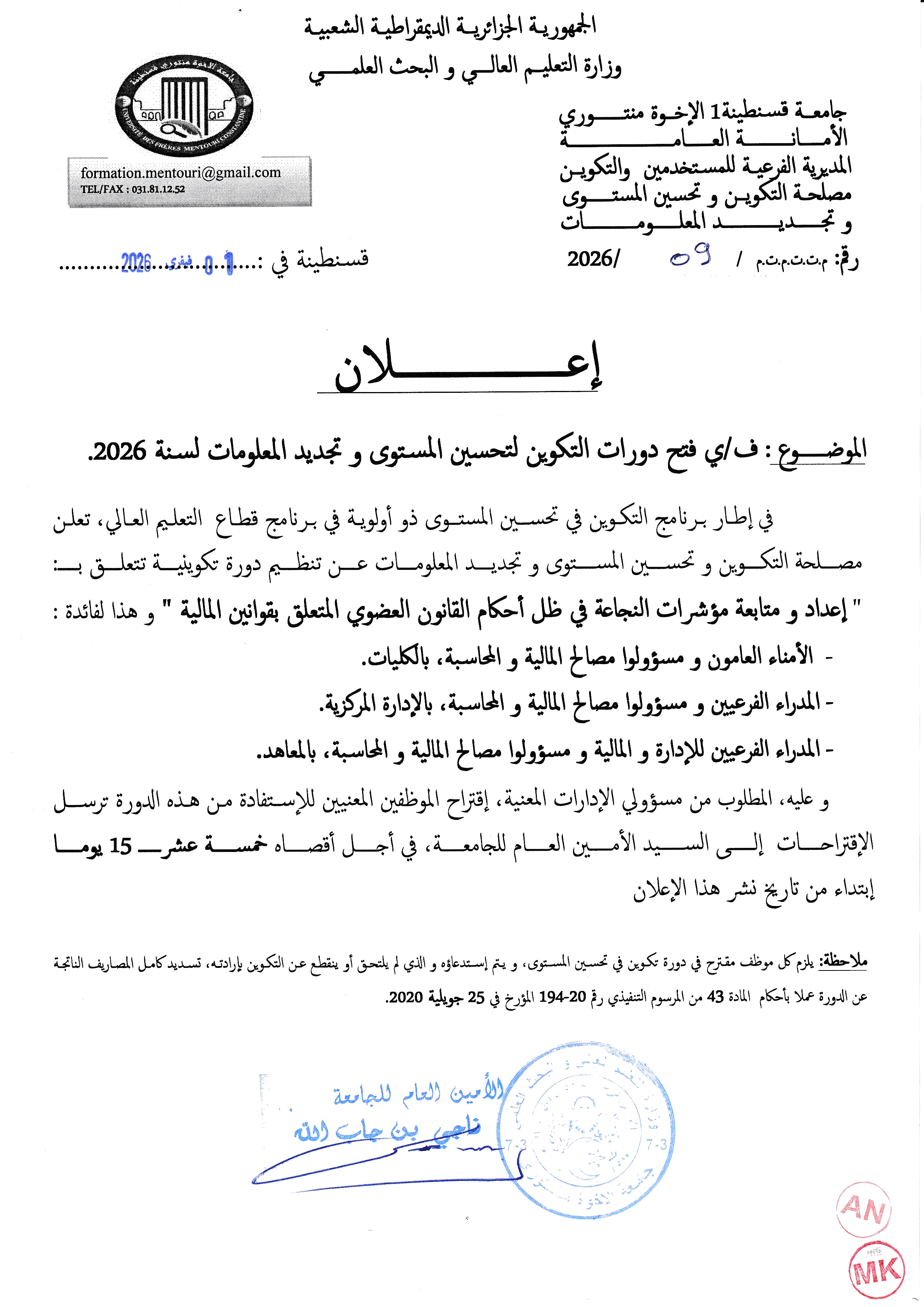 إعلان عن فتح دورة تكوينية لصالح الأمناء العامون والمدراء الفرعيون للمالية